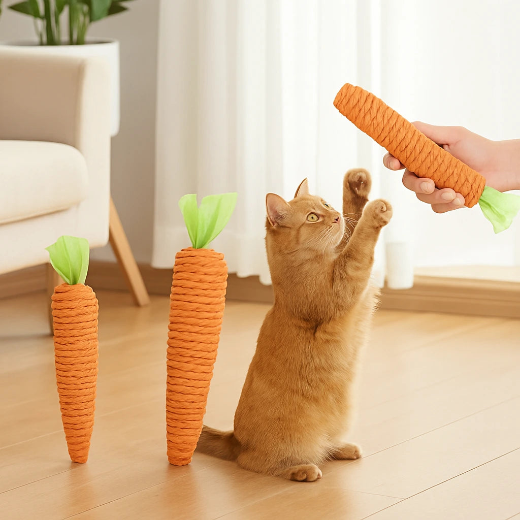 ✨ Funktioner: 🥕 Söt morotsdesign – fångar kattens uppmärksamhet direkt 🔔 Inbyggd bjällra – låter och lockar till interaktiv lek 🧵 Slitstarkt pappersrep – tål både tugg och klo 🐾 Bra för tänder och klor – perfekt för att tugga och riva 🐱 Passar alla katter – även små hundar och andra smådjur